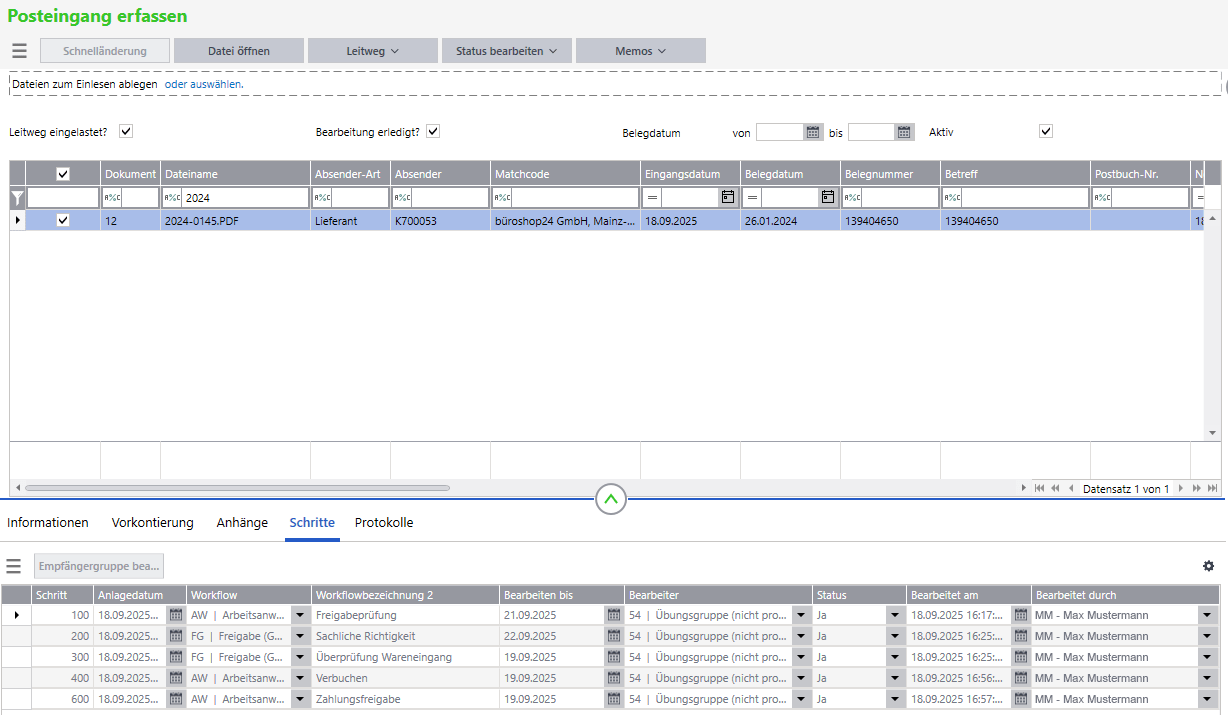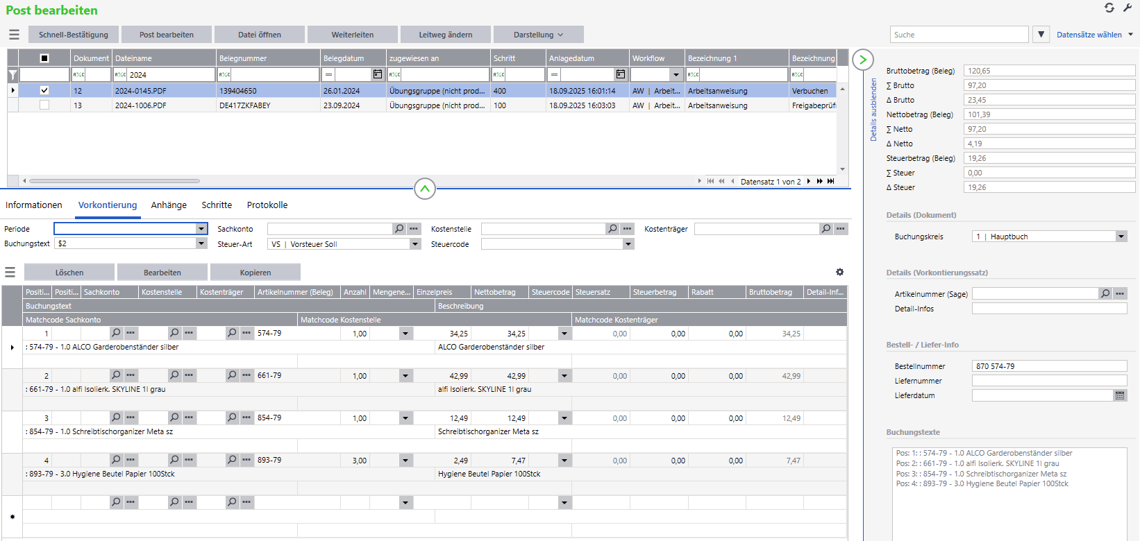 Nach der Freigabe der Buchung („OK / genehmigen“) ist diese in der Postbearbeitung nicht mehr sichtbar.