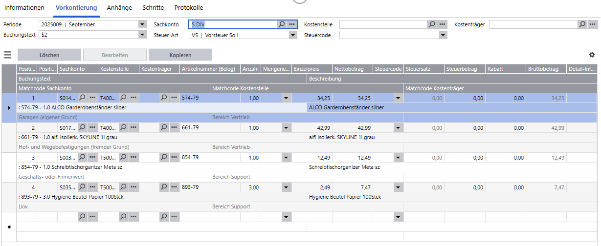 Ihre Rechnung enthält mehrere Sachkonten in den einzelnen Positionen? Fügen Sie das Kürzel „AS“ oder „S DIV“ unter dem Reiter Vorkontierung unter „Sachkonto“ ein. Anschließend kann für jede Position des Beleges ein eigenes Sachkonto ausgewählt werden.